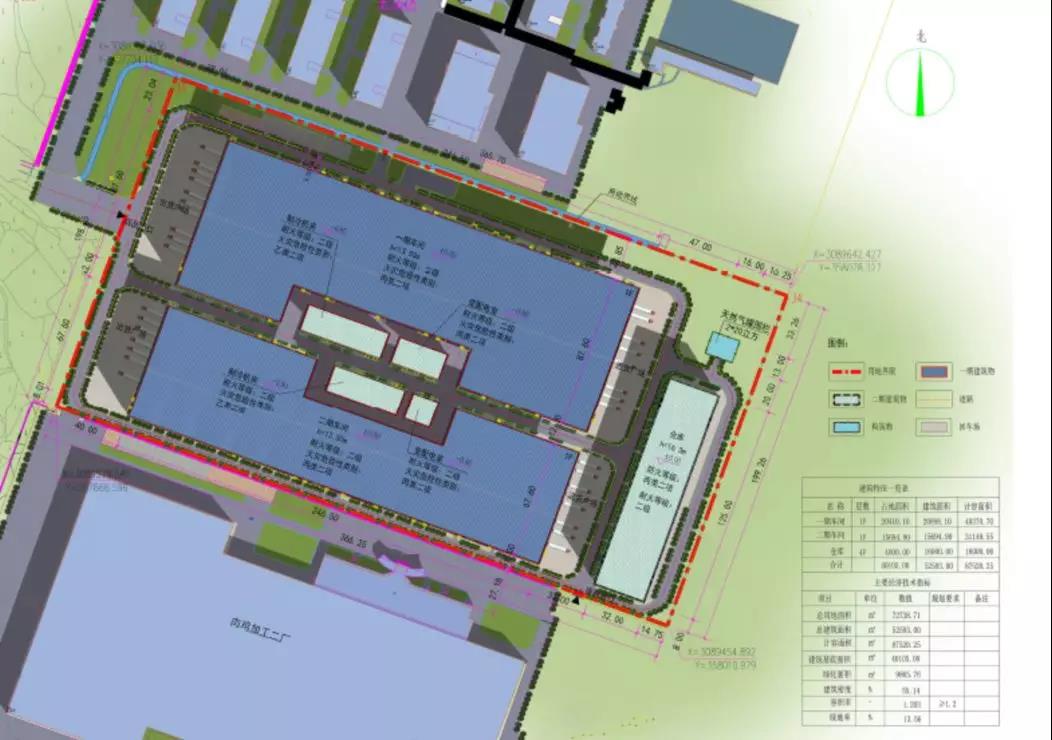 新建食品深加工项目规划用地面积72738.71㎡,总建筑面积52593.00㎡。项目分两期进行,一期项目总投资约12000万元,二期项目总投资约10000万元,建设两个独立加工车间。